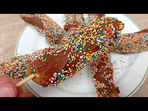 Retiramos las bananas del congelador y disfrutamos. Puedes decorar con maní, con coco, con chocolate blanco etc.