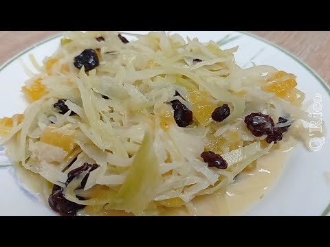 Para terminar en una olla grande mezclamos la piña con el repollo, añadimos las pasas, la crema de leche y el coco rayado.